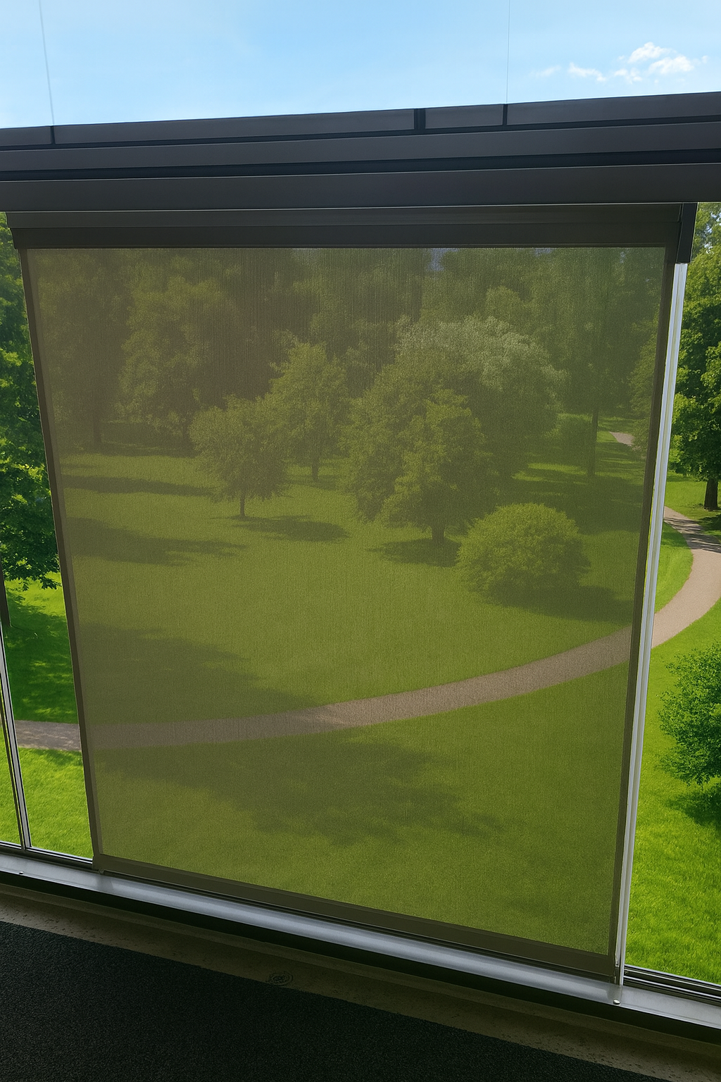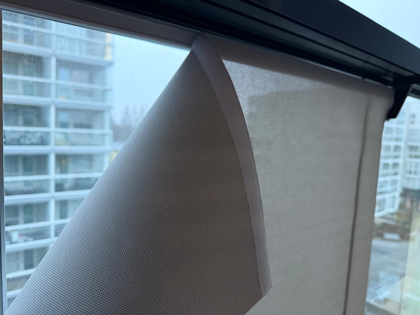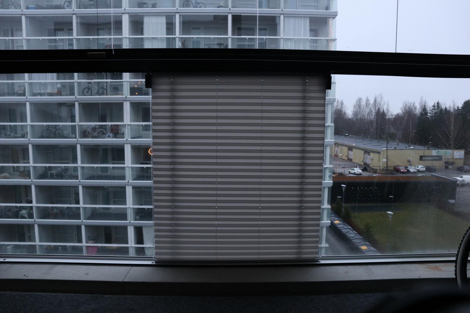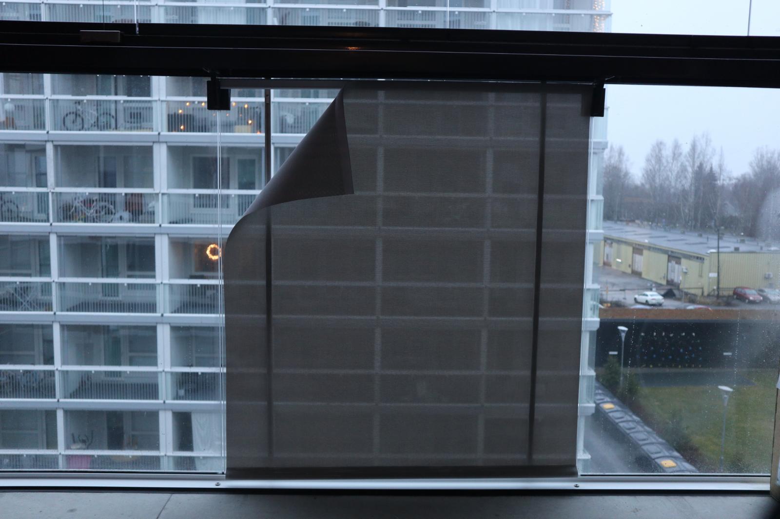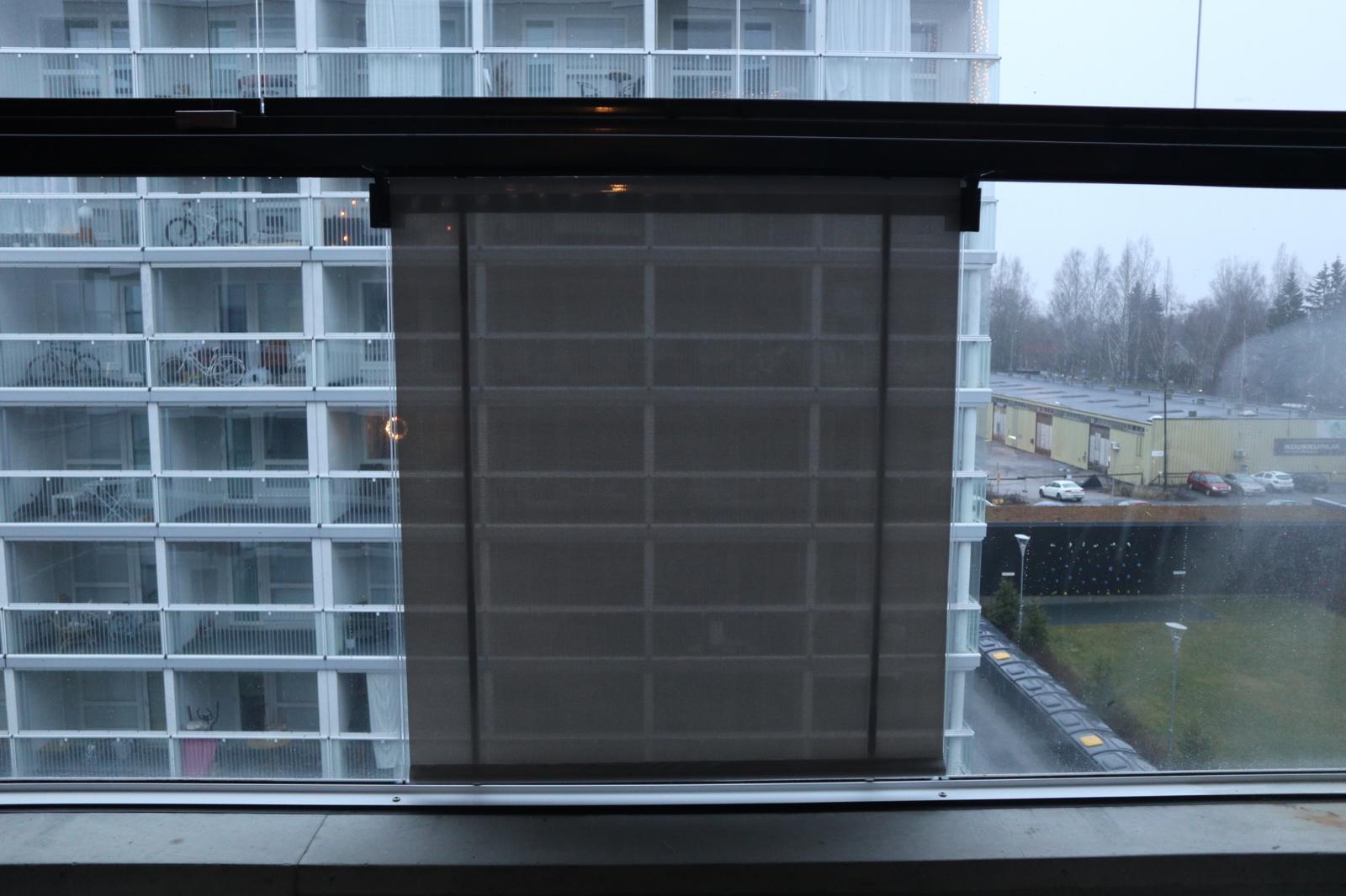 Screen-verhot suodattavat valoa kauniisti mutta säilyttävät osittaisen näkymän ulos. Kangas on läpikuultavaa screen-materiaalia.
